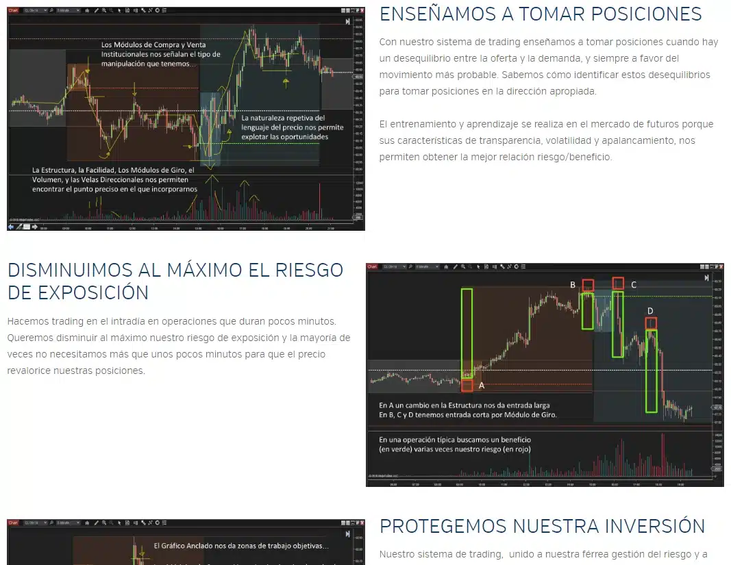 El PROGRAMA MILENIO (aquí puedes ver el programa completo de Trading de Futuros) trabaja todo lo que hace al ABC del trading: acumulación/distribución, resistencias y soportes, manipulación profesional, canales de tendencia, módulos de compra/venta institucionales, áreas de giro relevantes, velas direccionales, etc.