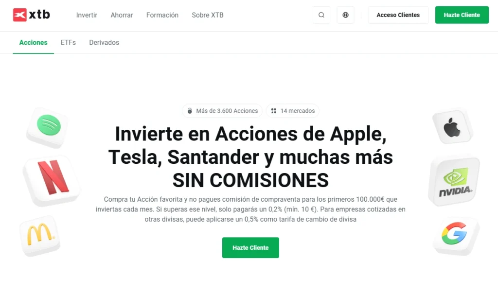 XTB es un bróker que también cotiza en bolsa y está regulado por varias entidades. Ofrece una buena variedad de activos y no cobra comisiones hasta que tu cuenta supere los 100,000 euros/usd. Además, permite compras recurrentes en sus planes de inversión con ETFs, lo que es ideal para inversores a largo plazo.