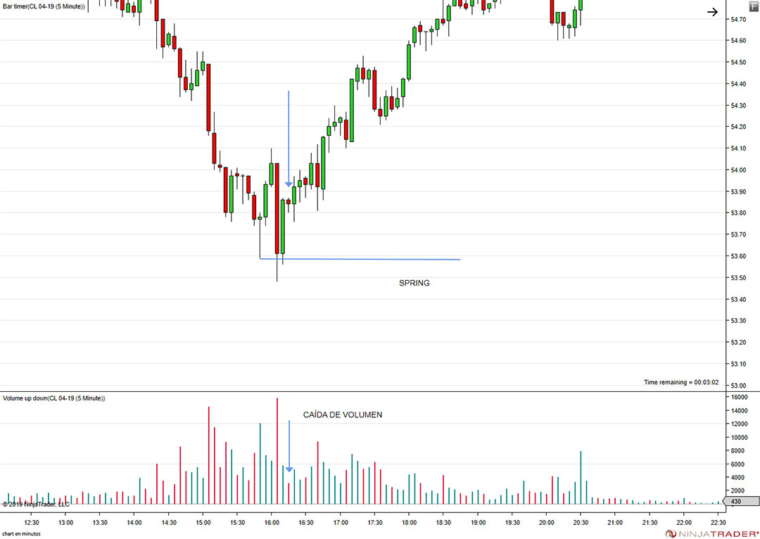 Tu disparador es nuevamente una vela roja bajista con caída de volumen. En el siguiente ejemplo lo vemos claro, no hay entrada de volumen a favor del movimiento en corto, por lo cual tras el doble suelo pondrás tu orden justo por encima de la apertura de la vela bajista que hace de disparador (siendo este un chart de 5 min tu orden se ejecutaría recién 20 minutos después)