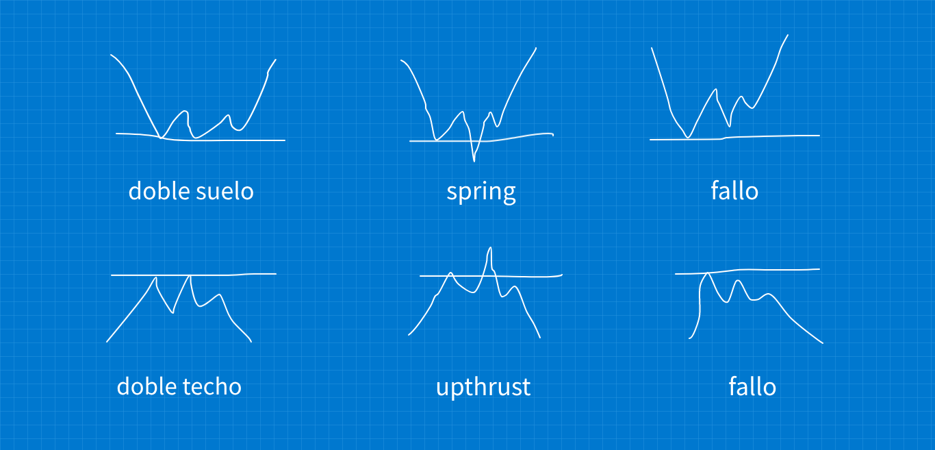 La entrada (o ventana de oportunidad) la buscaremos donde el precio haga un upthrust, un spring, un doble techo, un doble suelo o bien un fallo. Llamaremos a estos movimientos ‘patrones de giro’