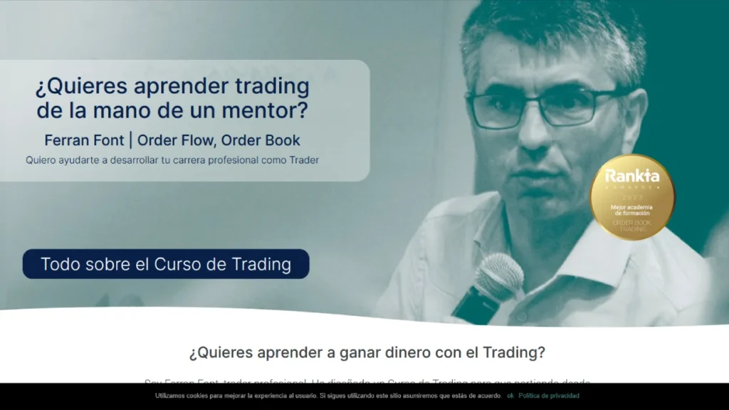 Curso de day trading basado en la lectura del order book con enfoque profesional. Ferran Font fue premiado como mejor academia Rankia 2023/24, es campeón de trading (Wilmott Quantitative Trading 2014) y colabora con la Bolsa de Comercio de Madrid con frecuencia.