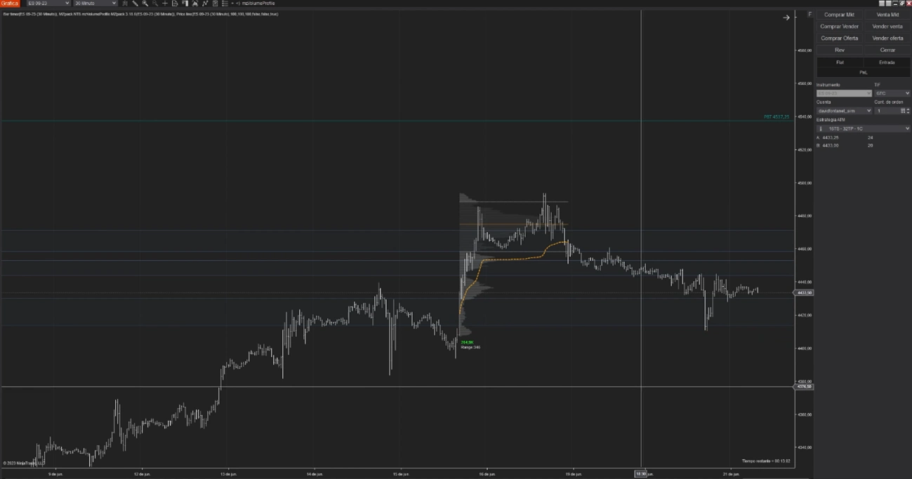 Finalmente, y lo más importante, cuando tenga un sentimiento de mercado a favor, esperaré a que el precio cruce el nivel que estoy esperando, que, por lo general, será alguna de las orillas del value área (zona de valor del perfil de volumen).