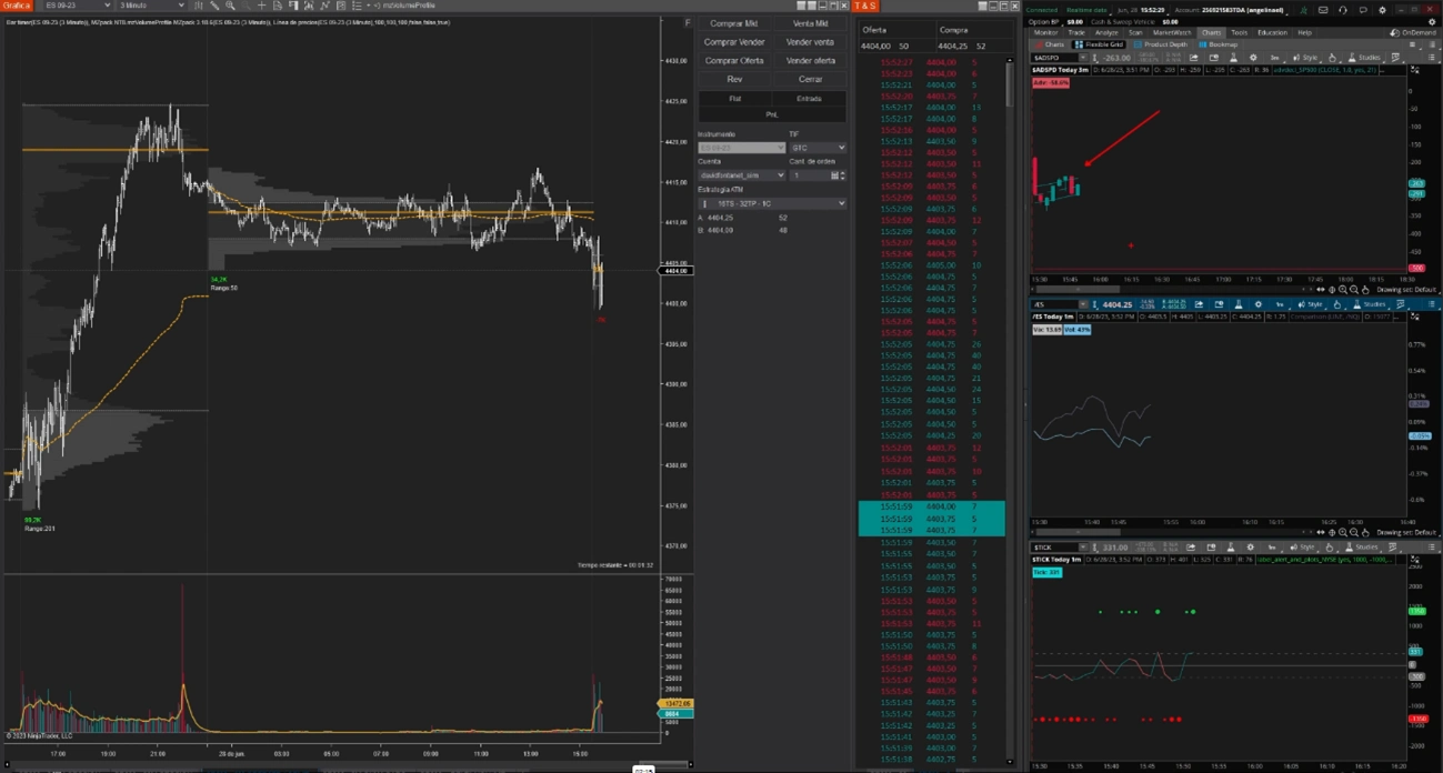 Por eso mismo me centro única y exclusivamente en el volumen a mercado que entra en el time & sales, o lo que es lo mismo, la cinta (órdenes de compra y venta a mercado). Allí buscaré cambios en los patrones de entrada de volumen que sugieran la entrada a mercado de las manos fuerte.