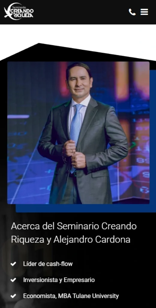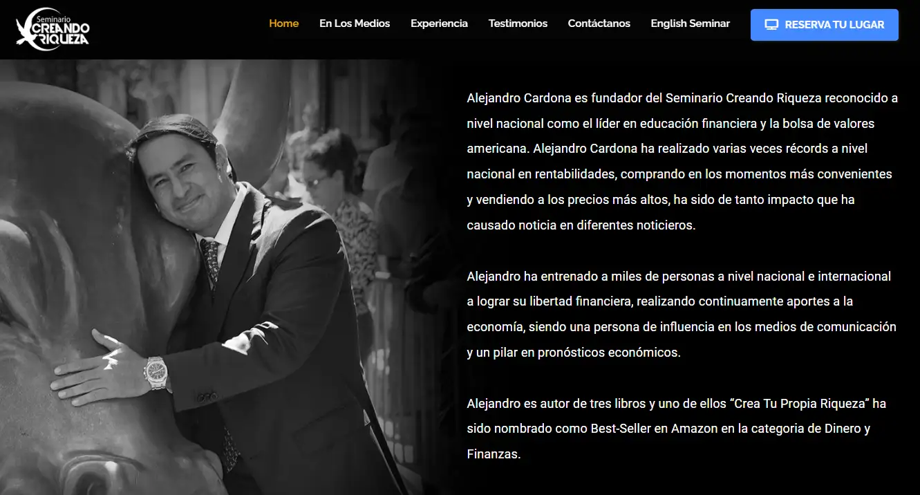 Alejandro Cardona es de esos nombres que te terminan apareciendo aunque no lo busques demasiado. Economista, emprendedor, colombiano viviendo en Estados Unidos, con visibilidad mediática por entrevistas y apariciones en el show de Jaime Bayly. Y, sobre todo, por su producto más conocido: el Seminario Creando Riqueza, un intensivo de dos días orientado a gente que está empezando en bolsa e inversiones.
