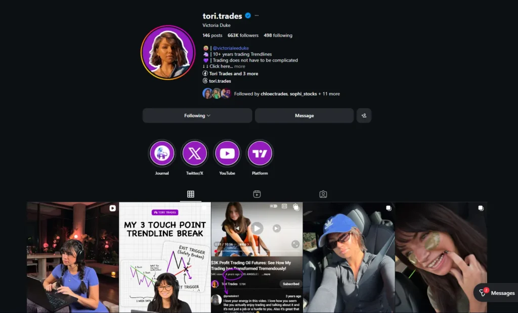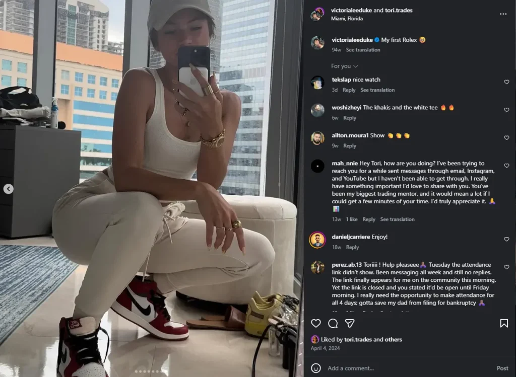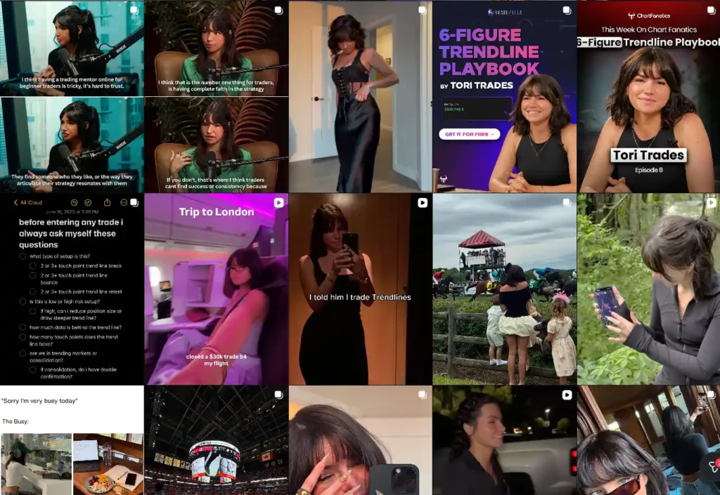 Tori Trades sería el ejemplo perfecto de eso. Una influencer del trading que construye una ilusión: la ilusión de que opera como profesional, de que tiene un método infalible, de que sus alumnos están a un paso de la libertad financiera si solo siguen su sistema.