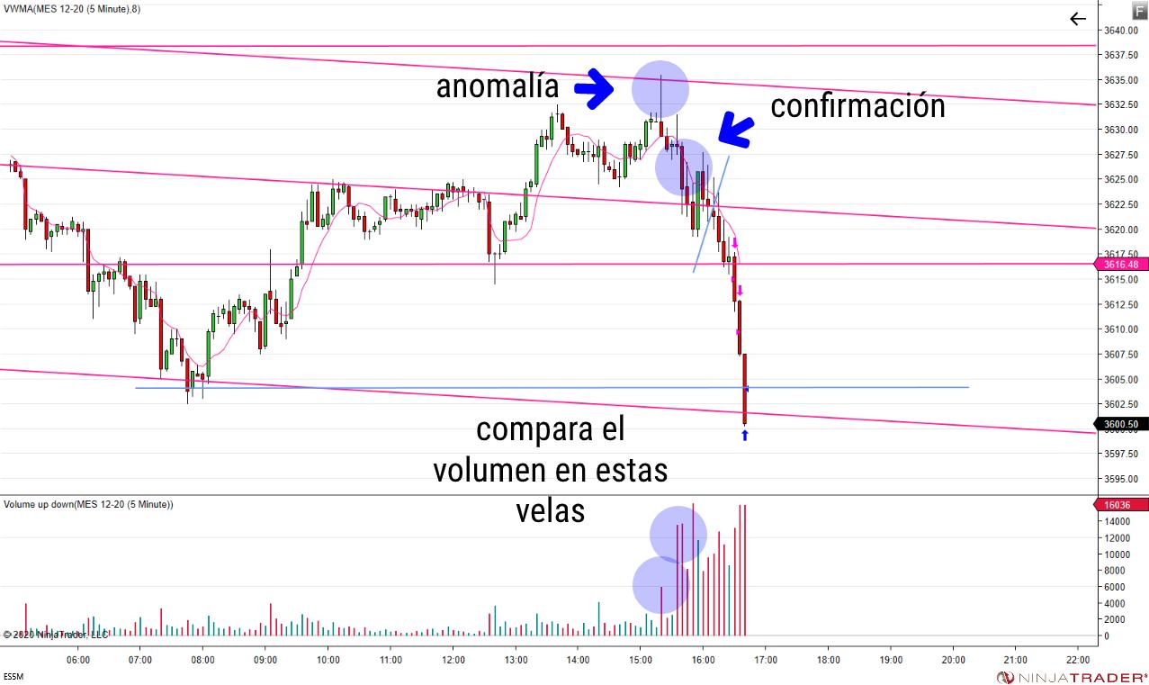 El análisis de las anomalías y la confirmación lo hago en el timeframe de 5 min (¿no sabes lo que es una anomalía en el trading?). Siendo que mi estructura es a la baja me limitaré a buscar cortos, entonces, mi anomalía deberá hacerse presente bajo resistencia.