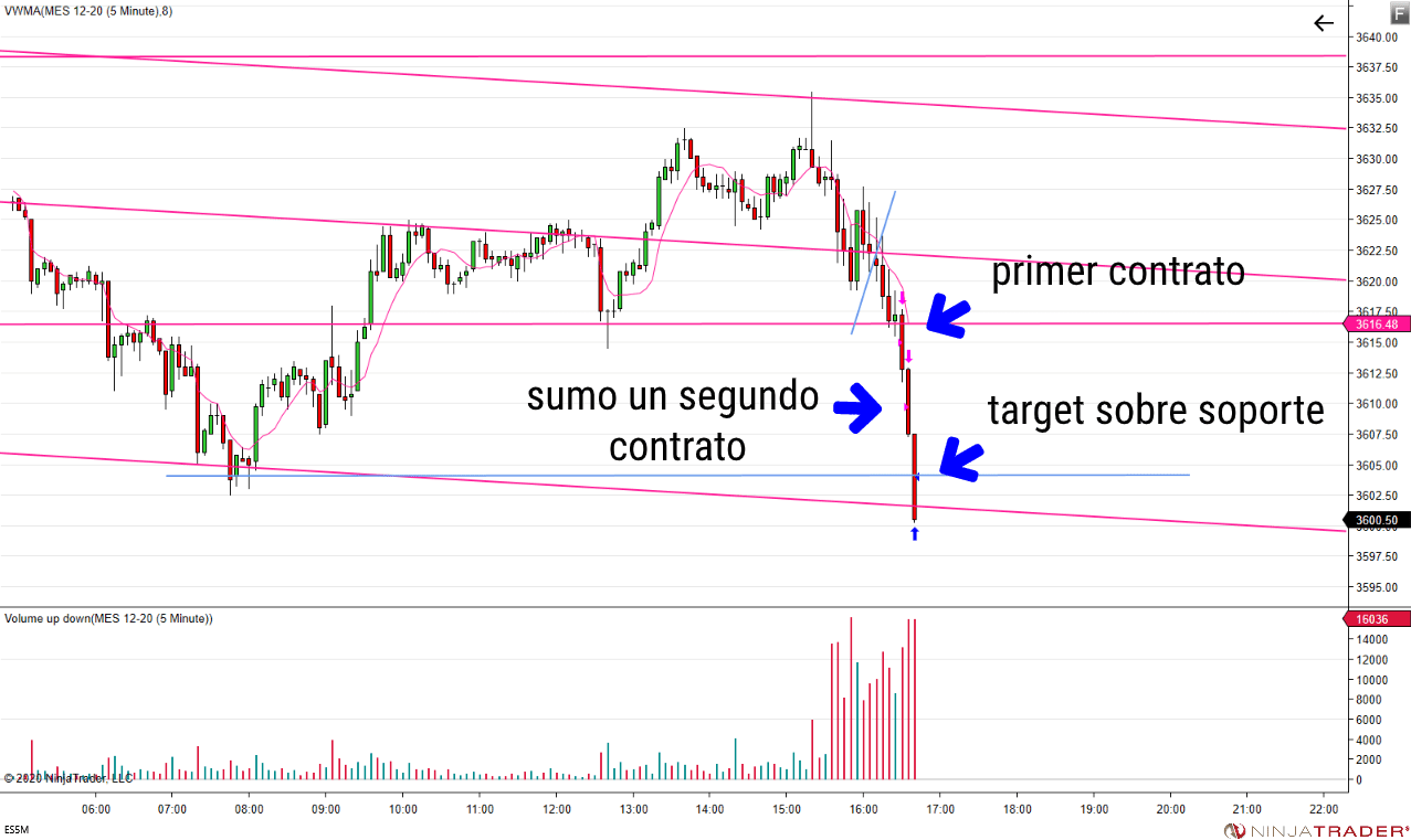 No obstante cuando el precio hace 20 ticks a favor busco un retroceso que me de oportunidad de sumar un segundo contrato a mi posición ganadora.